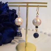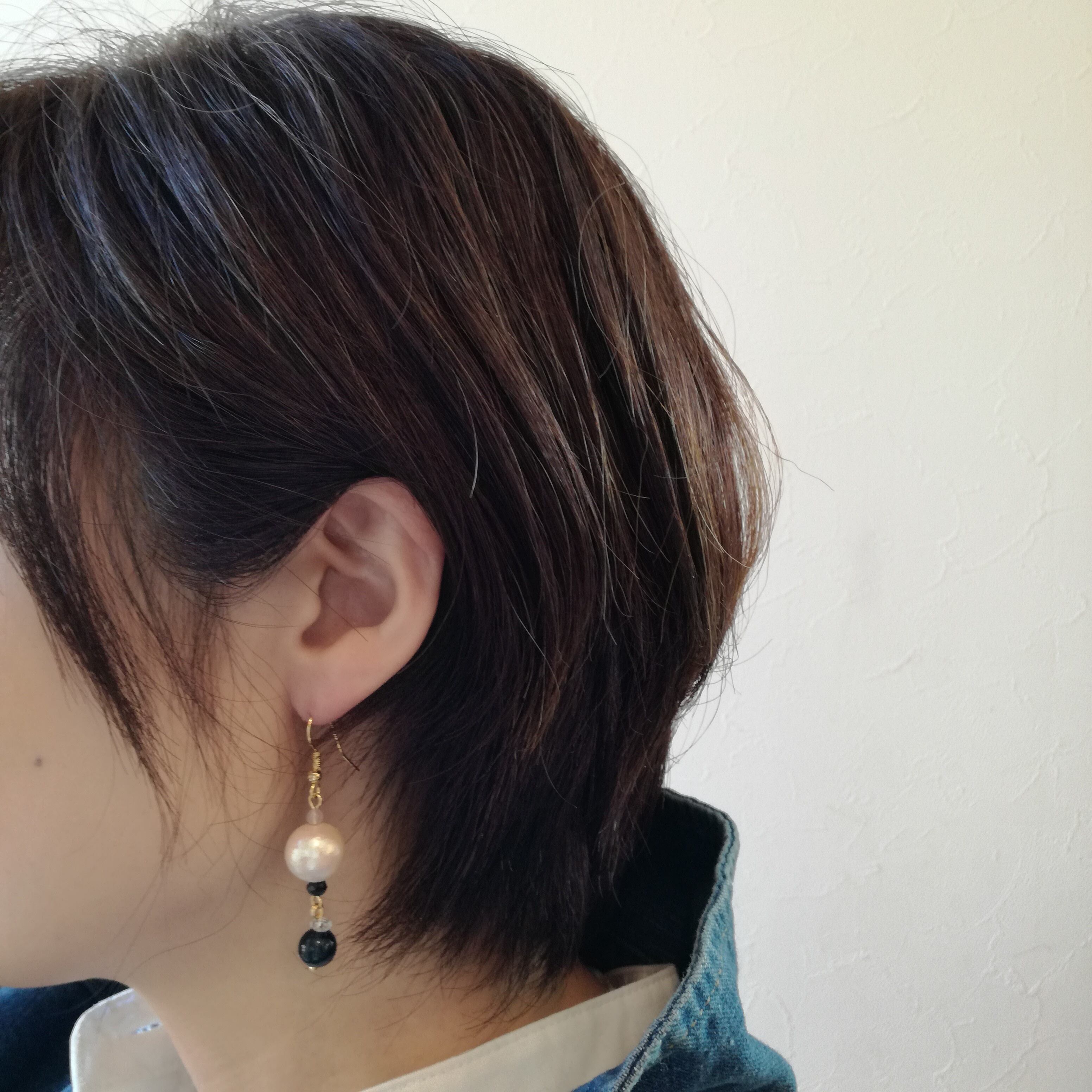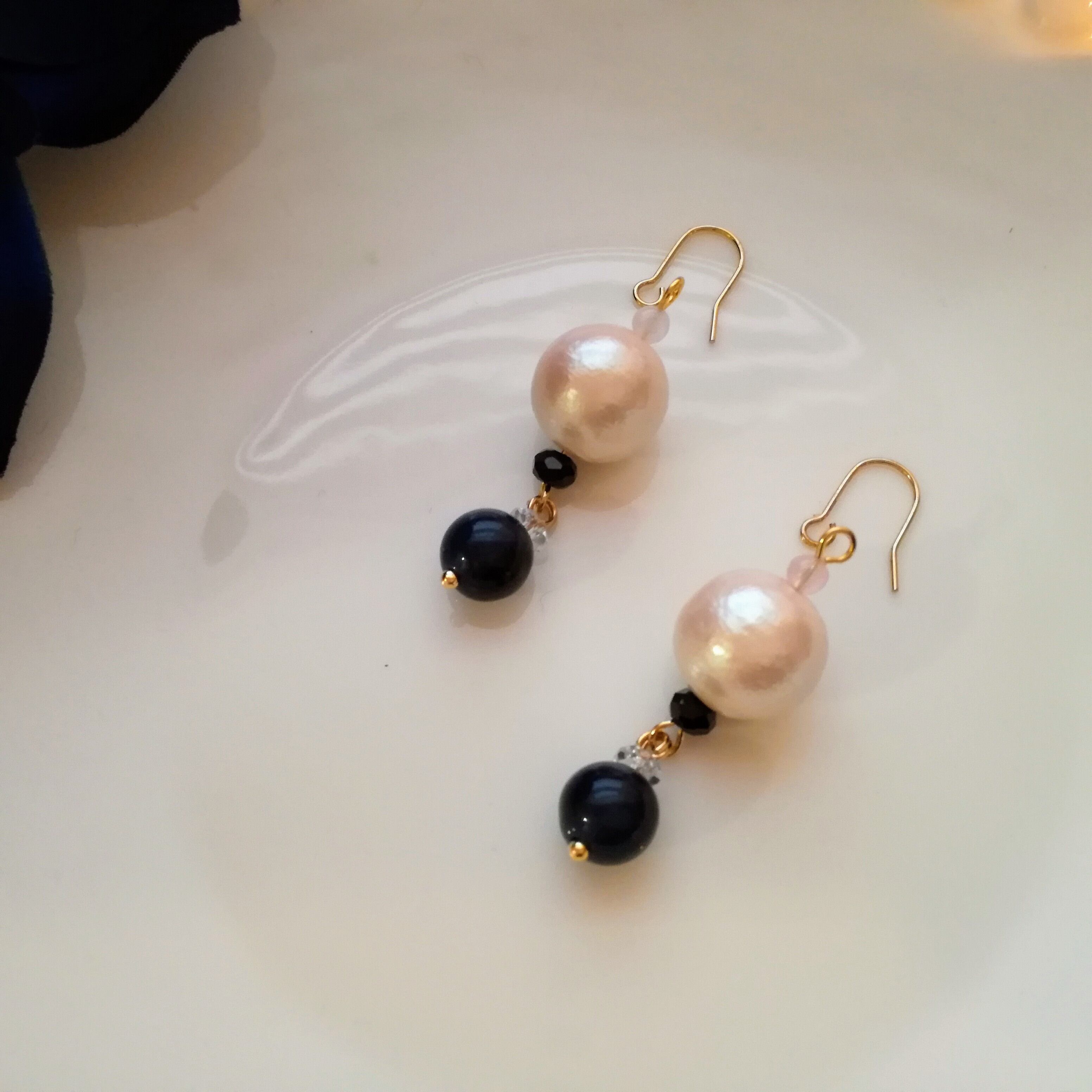 大ぶりのコットンパールと紺色のウィンタースカイジェイドの組み合わせ。上品で落ちついた印象にしてくれます。