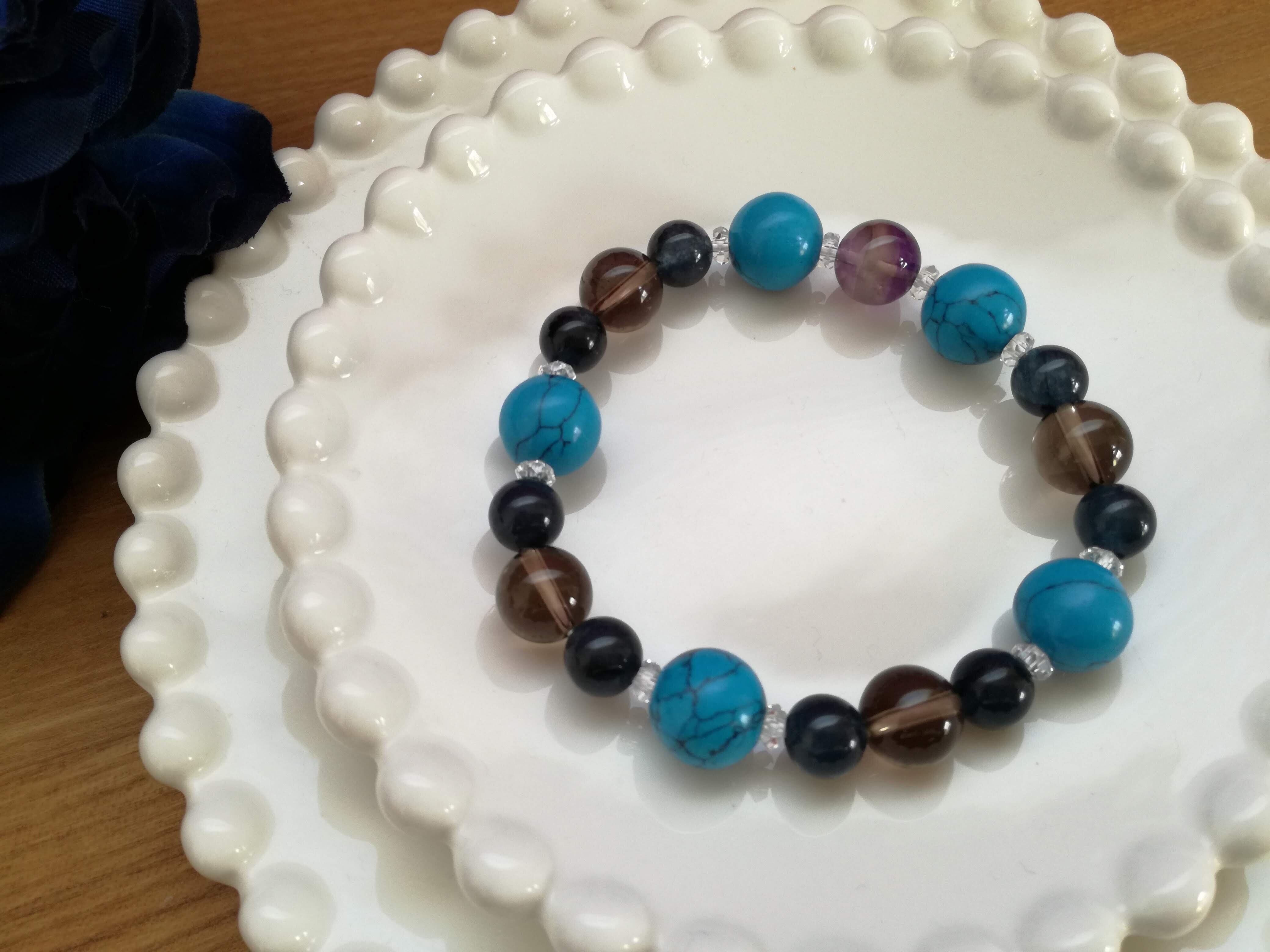 ターコイズを基調に、ウィンタースカイジェイド、スモーキークォーツなどを合わせたブルー系のブレスレット。