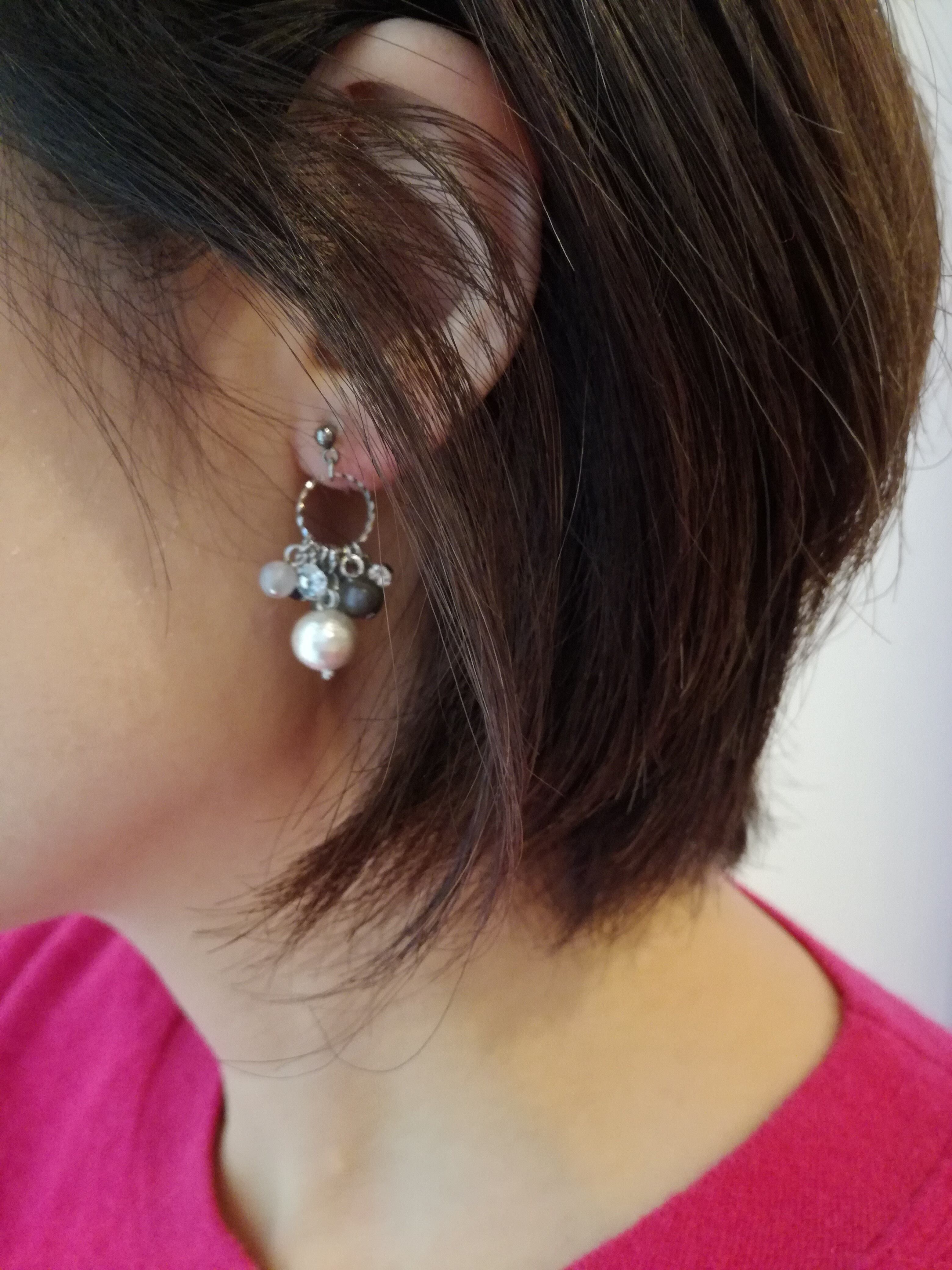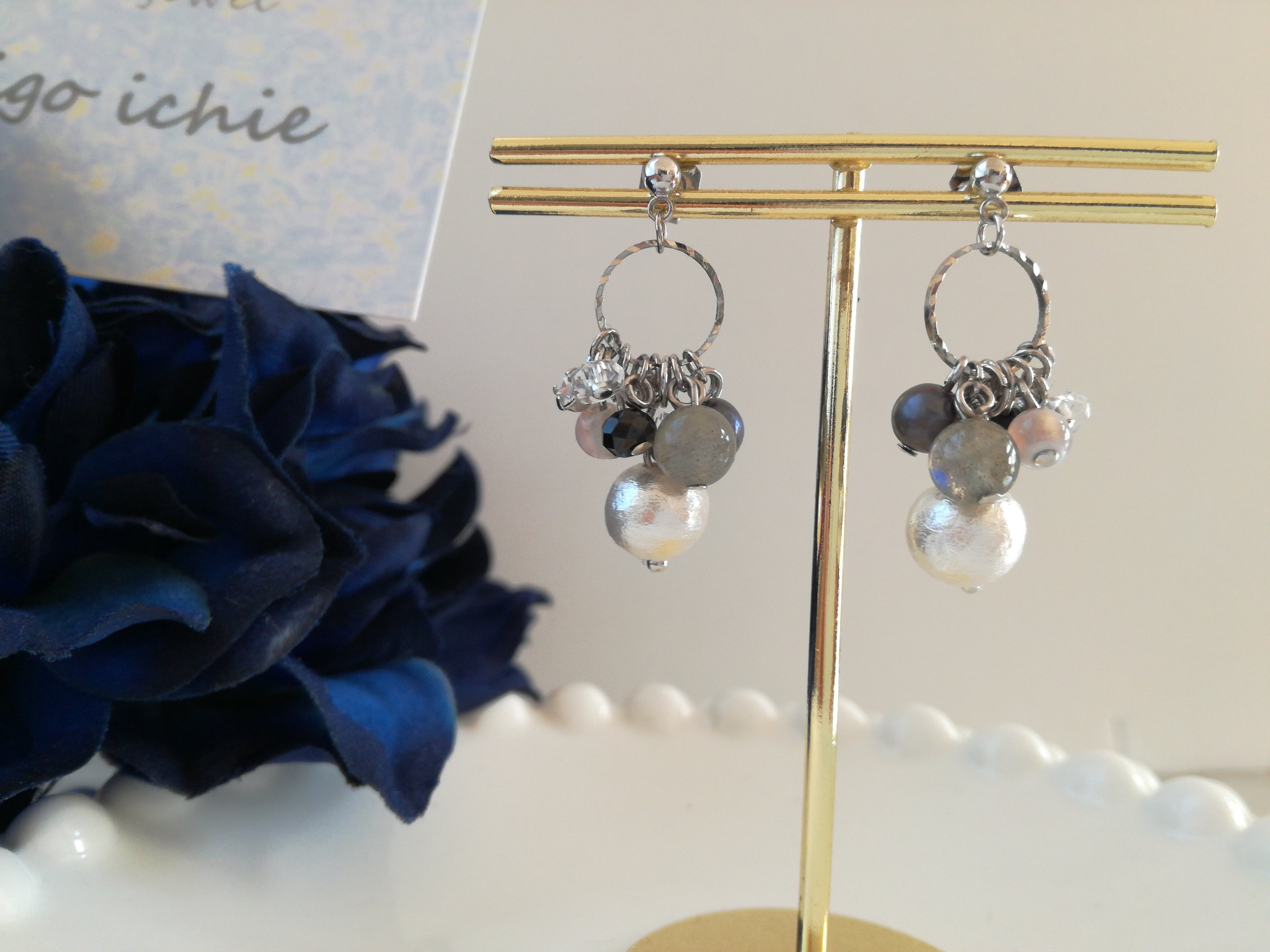 コットンパールを中心に白から黒への天然石のグラデーションがキレイです。小粒ですが、ひとつひとつキラキラして、かわいらしい印象に。