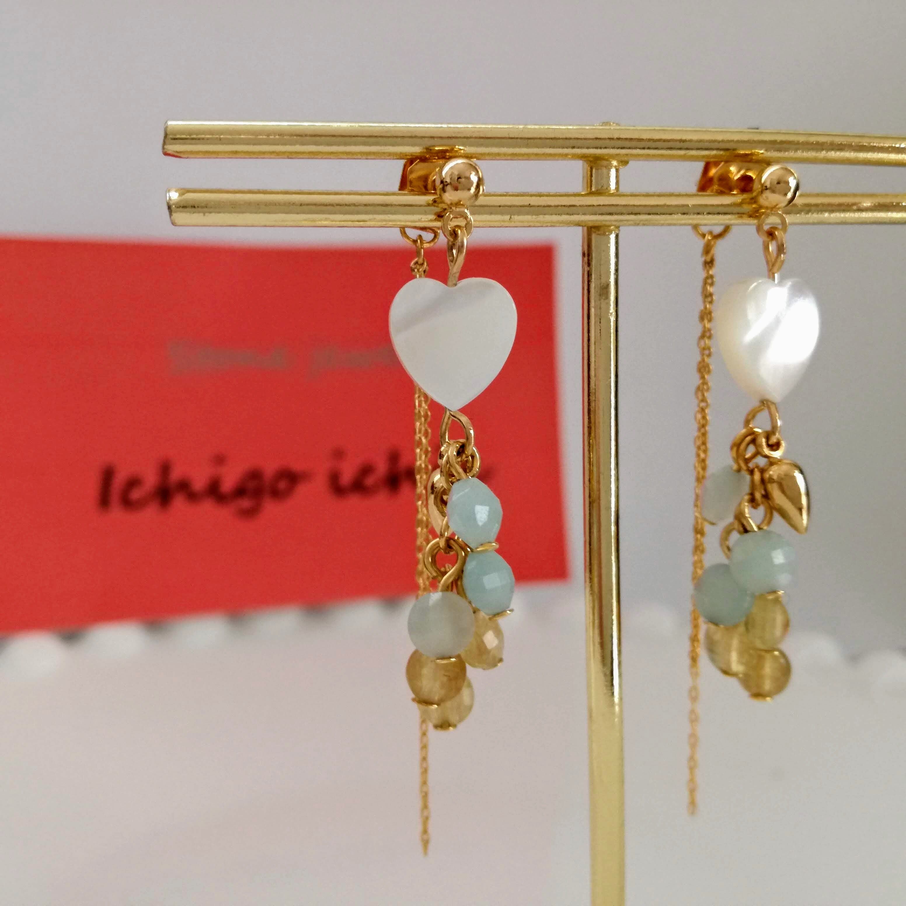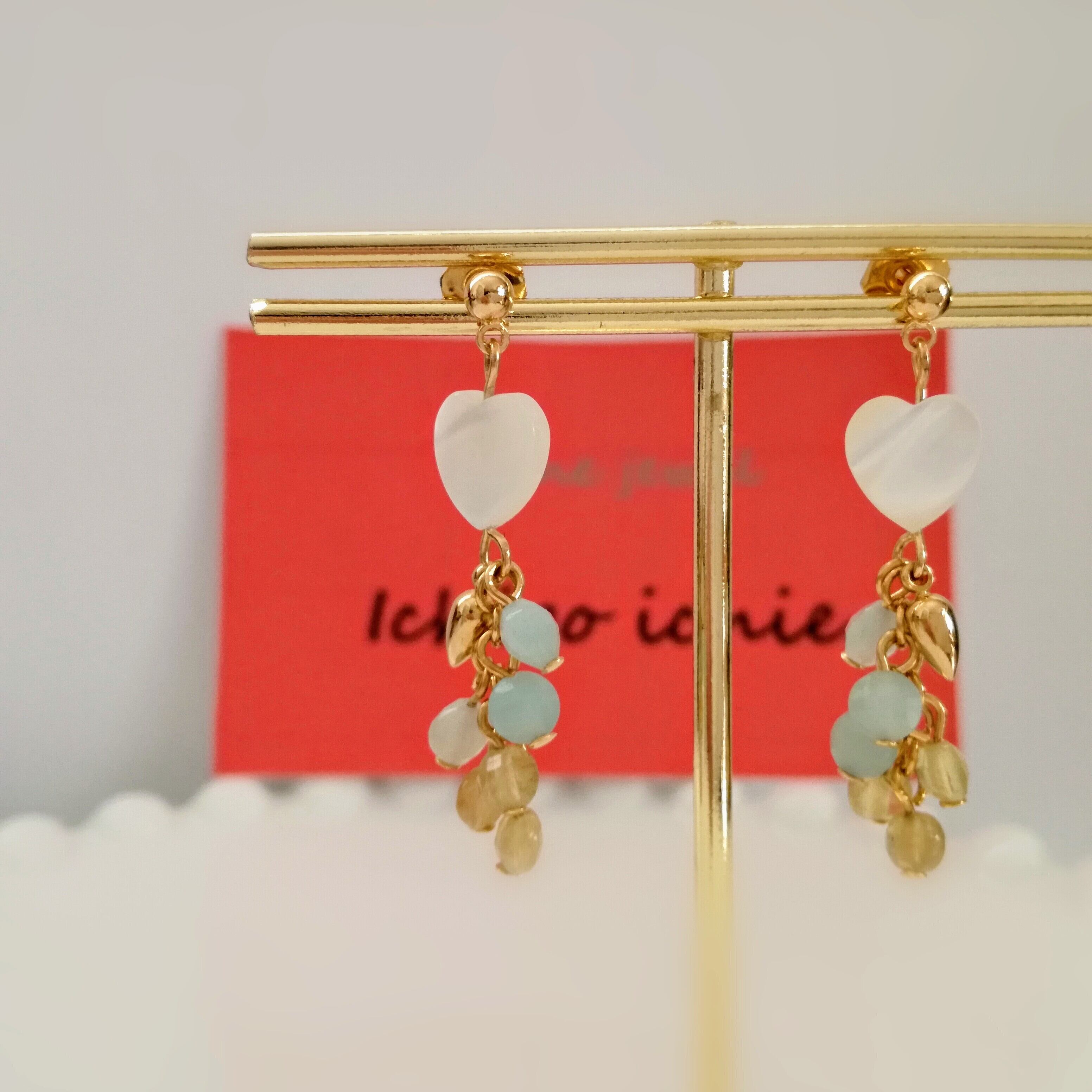 マザーオブパールのハート型にアマゾナイトやゴールデンアパタイトを合わせて、甘い雰囲気のピアスにしました。