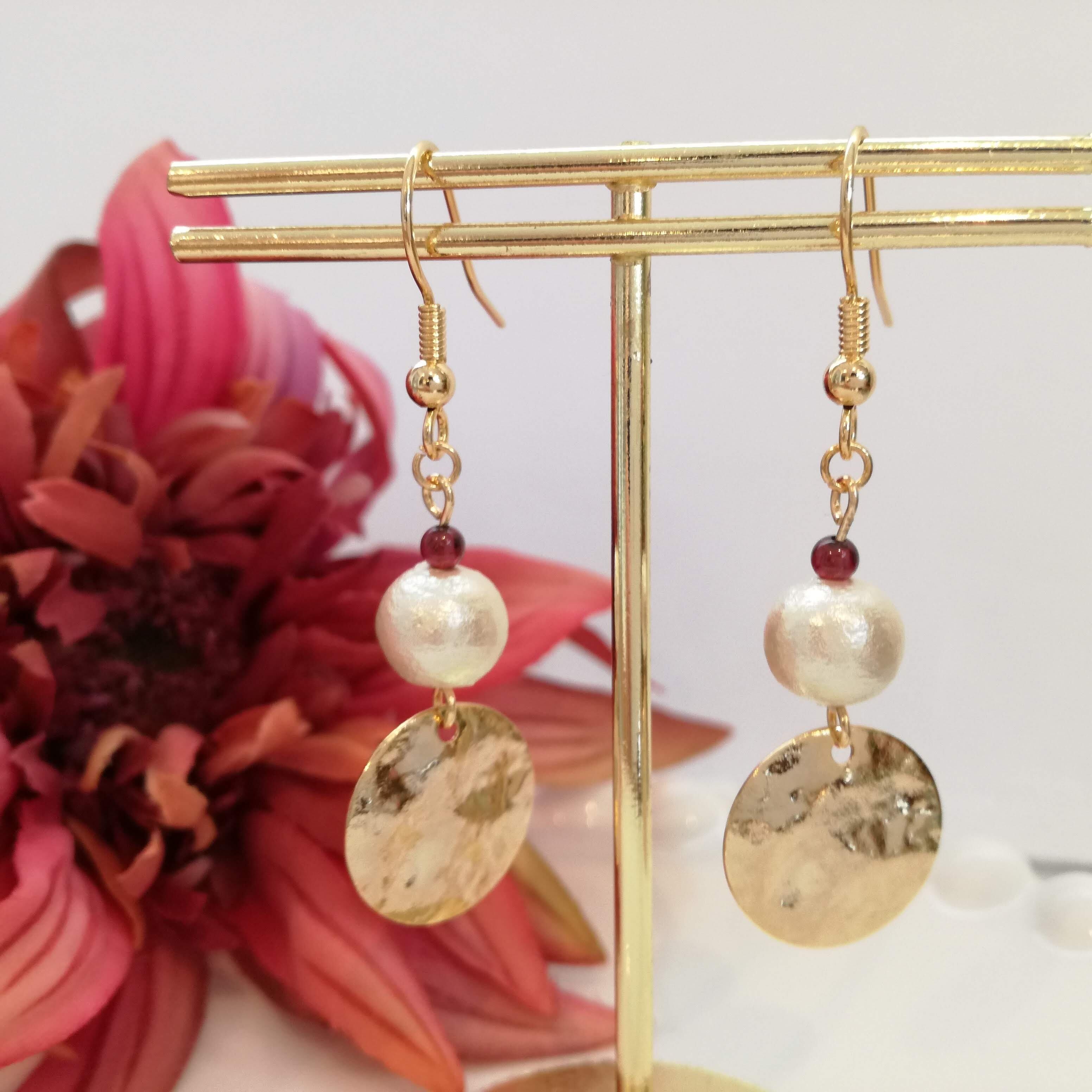 コットンパールとゴールドの上品な組み合わせに、ガーネットの青みがかった赤がアクセントになり、落ち着いた中にも、個性的な印象を受けます。