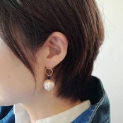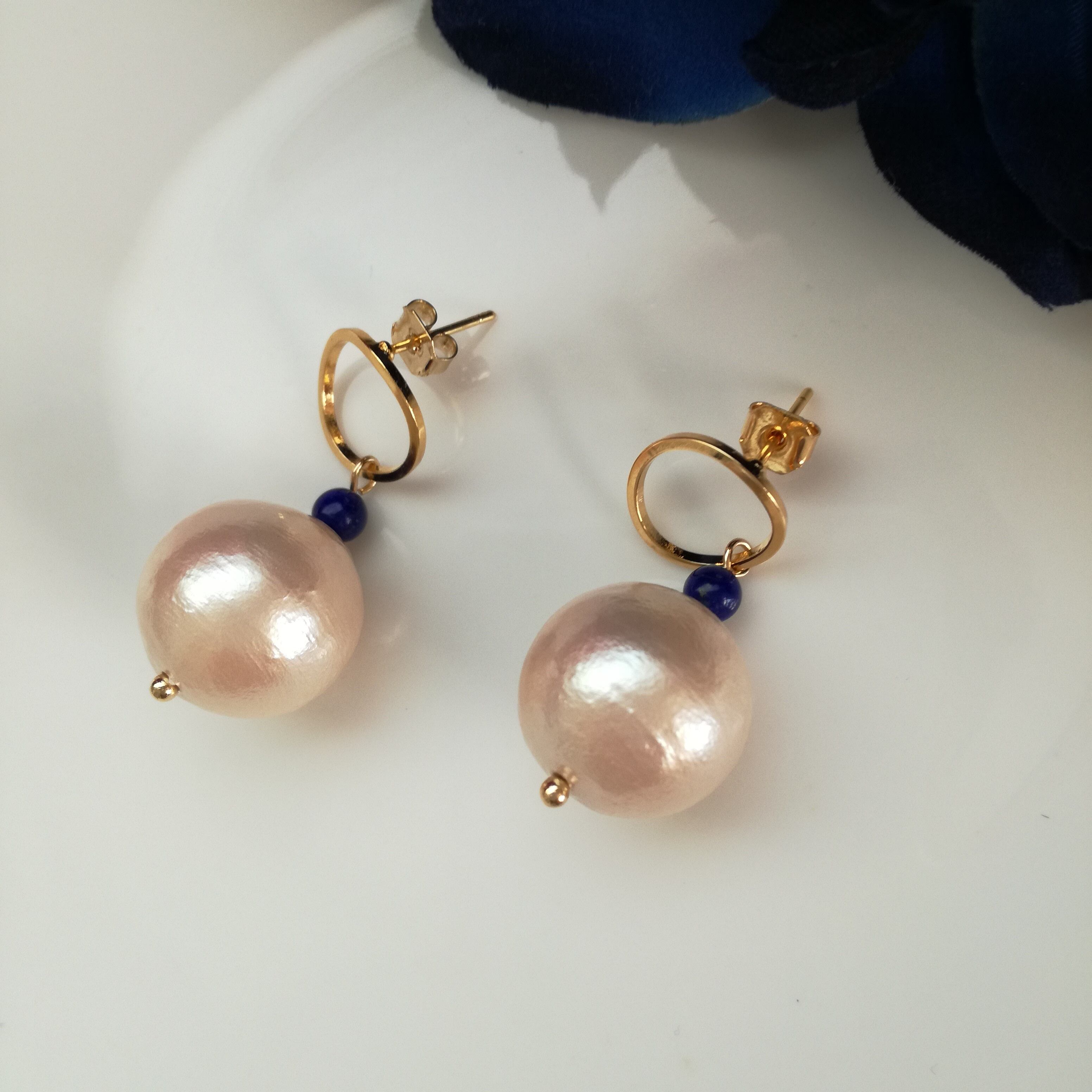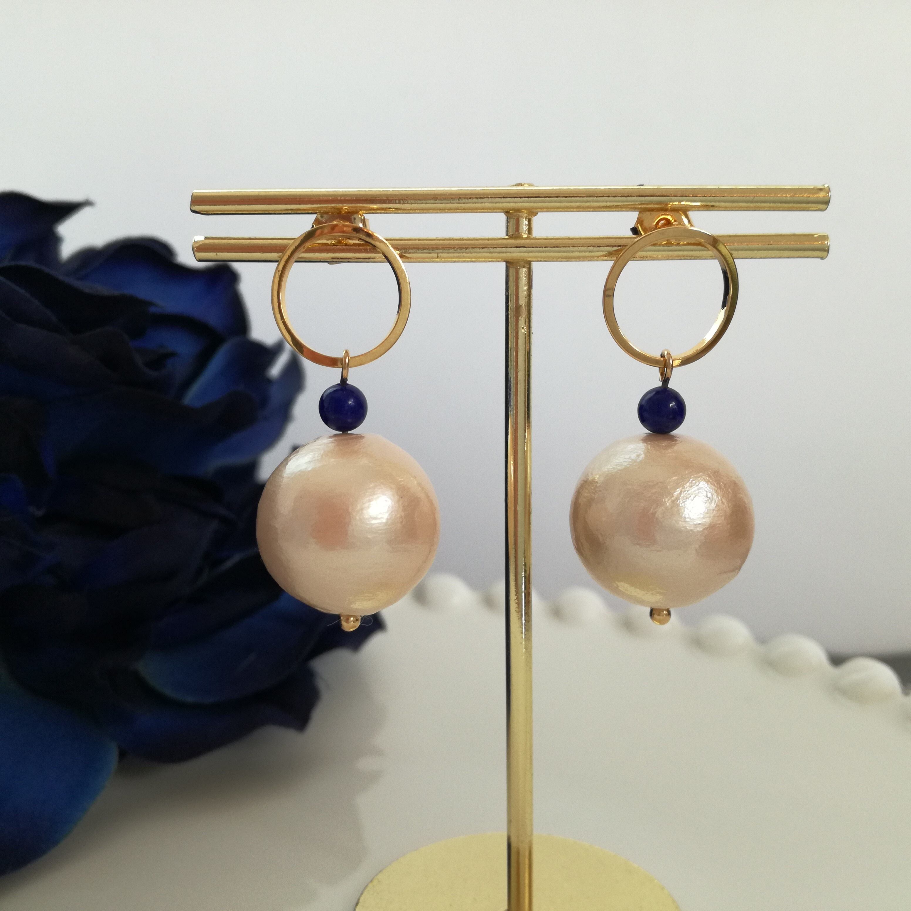 大ぶりのコットンパールに鮮やかなラピスラズリのブルーを効かせて、上品で存在感のあるピアスに。
