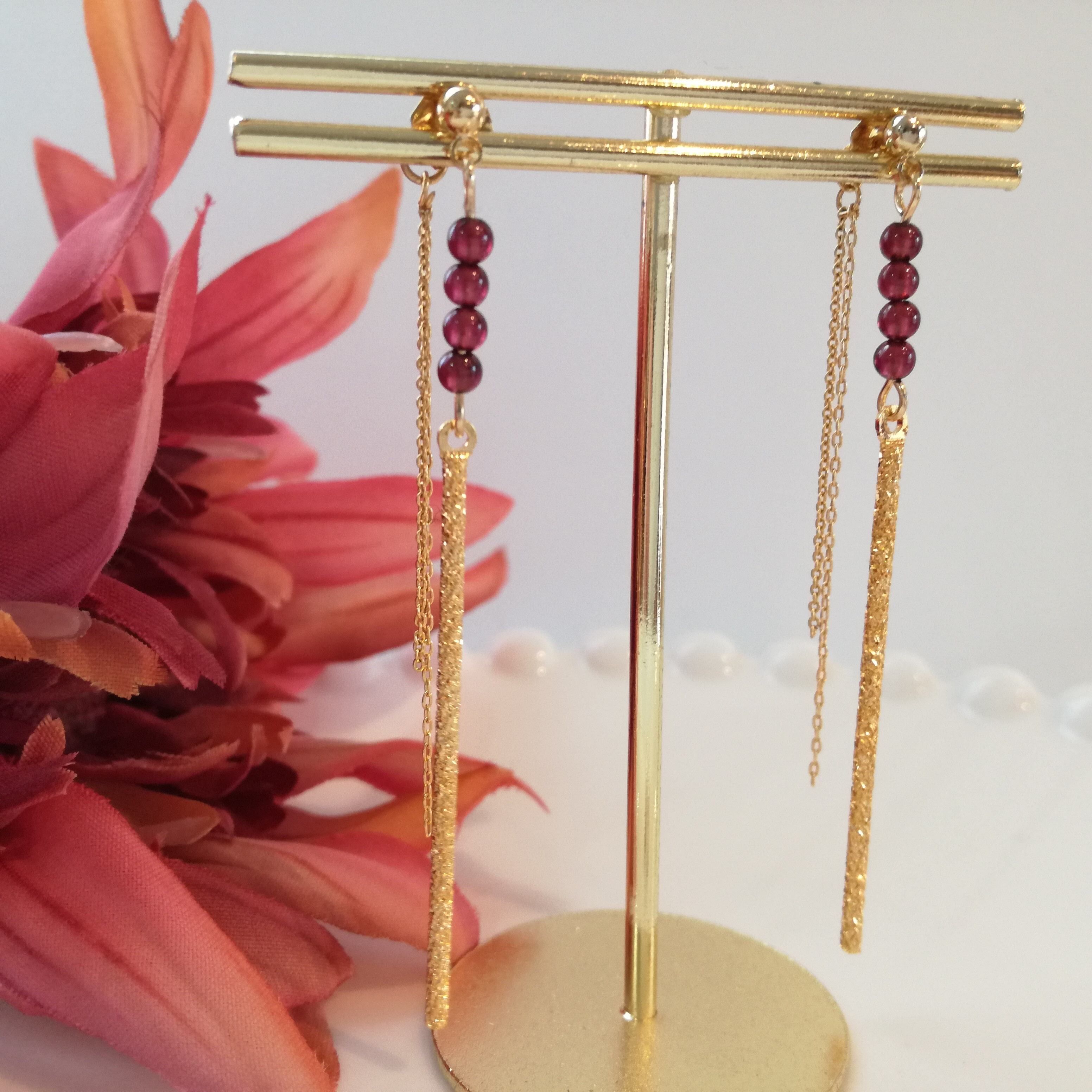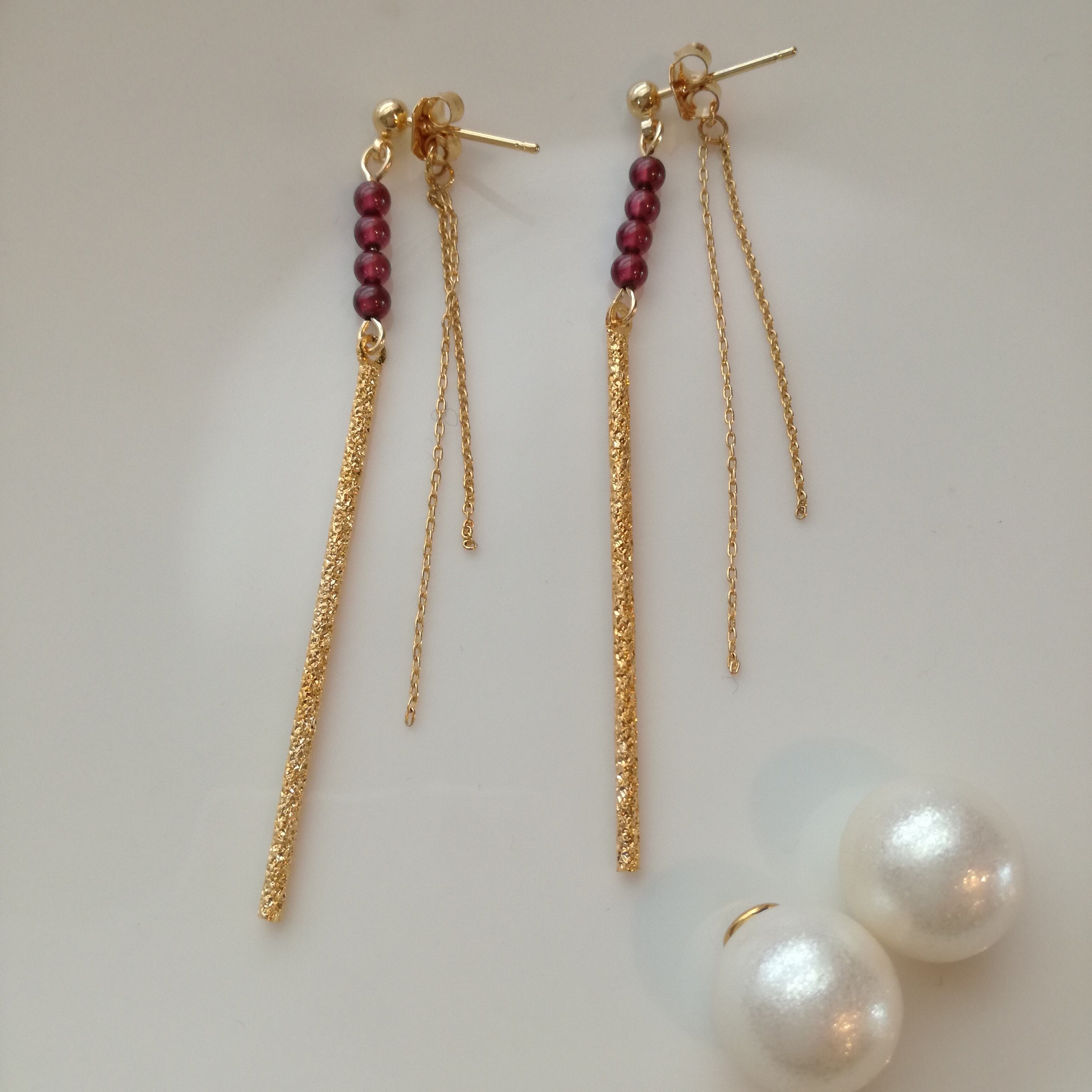 ワインレッドのガーネットを4つ並べて、ゴールドスティックをぶら下げました。