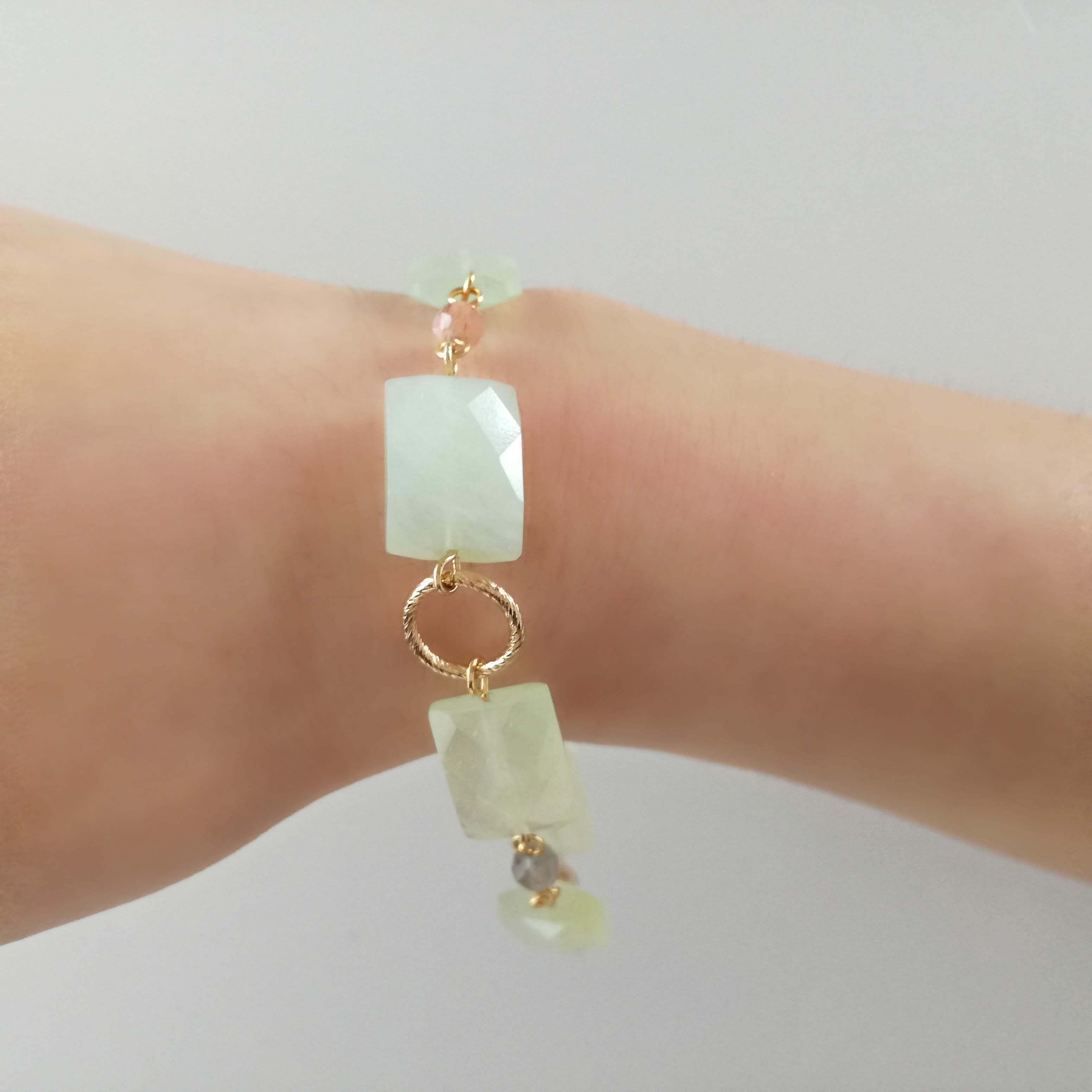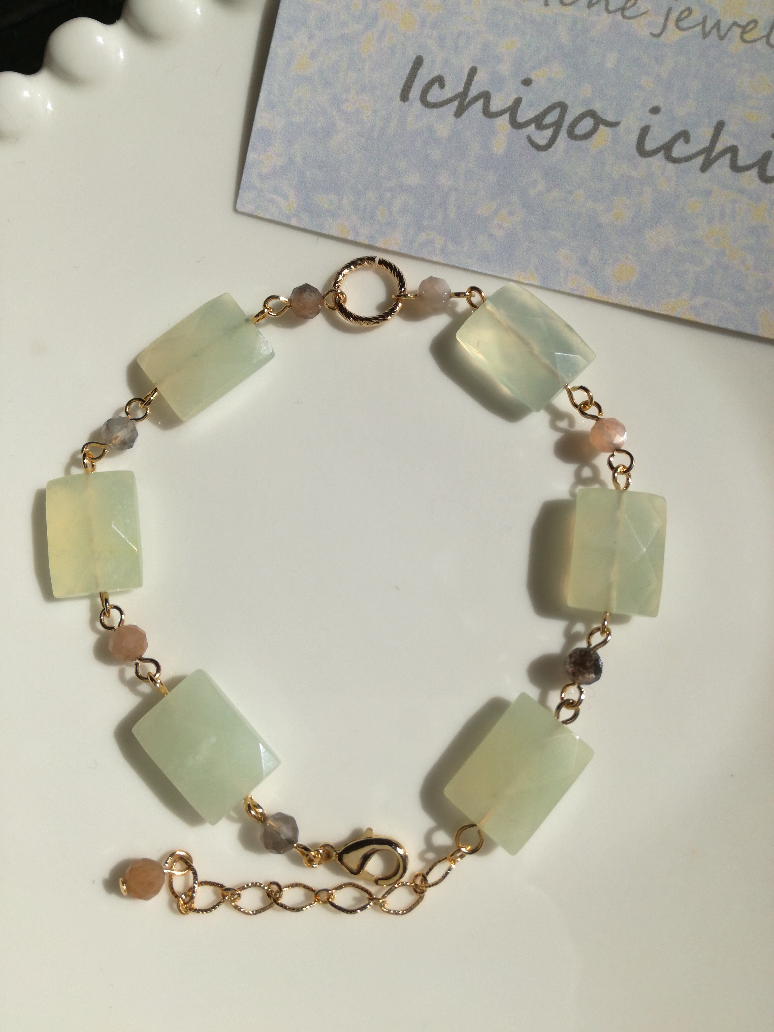 爽やかな新緑をイメージして、薄いグリーンのニュージェイドとフェルドスパー(オレンジムーンストーン、ラブラドライトなど)交互に並べました。