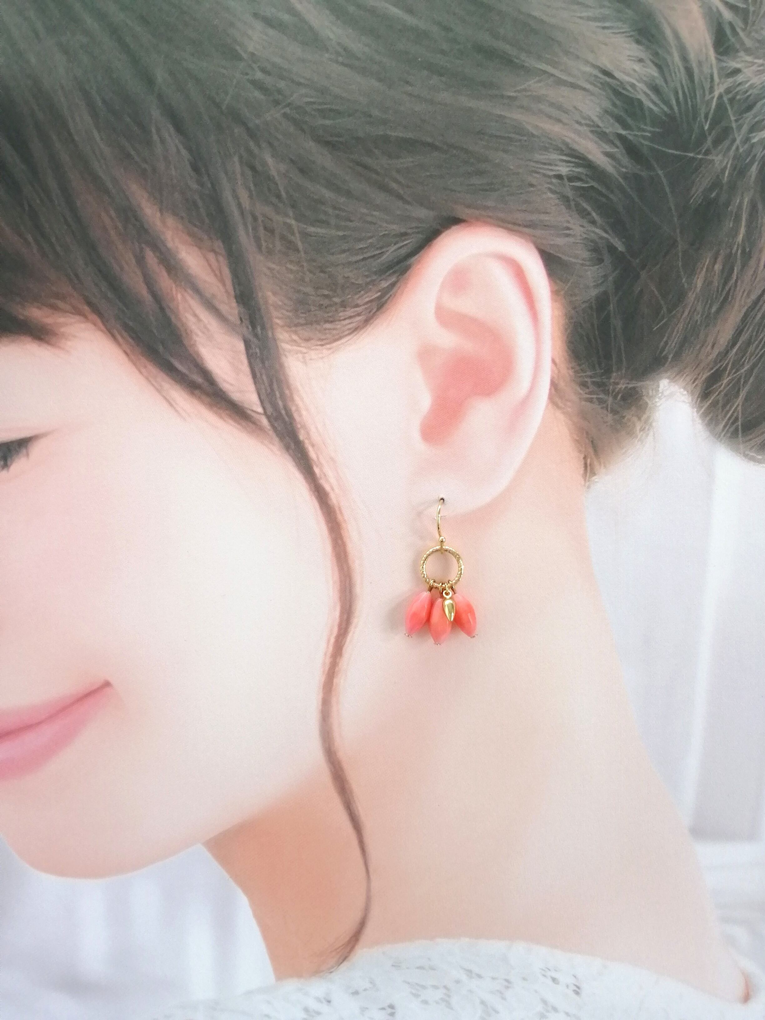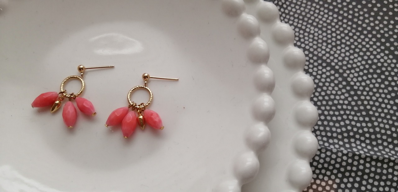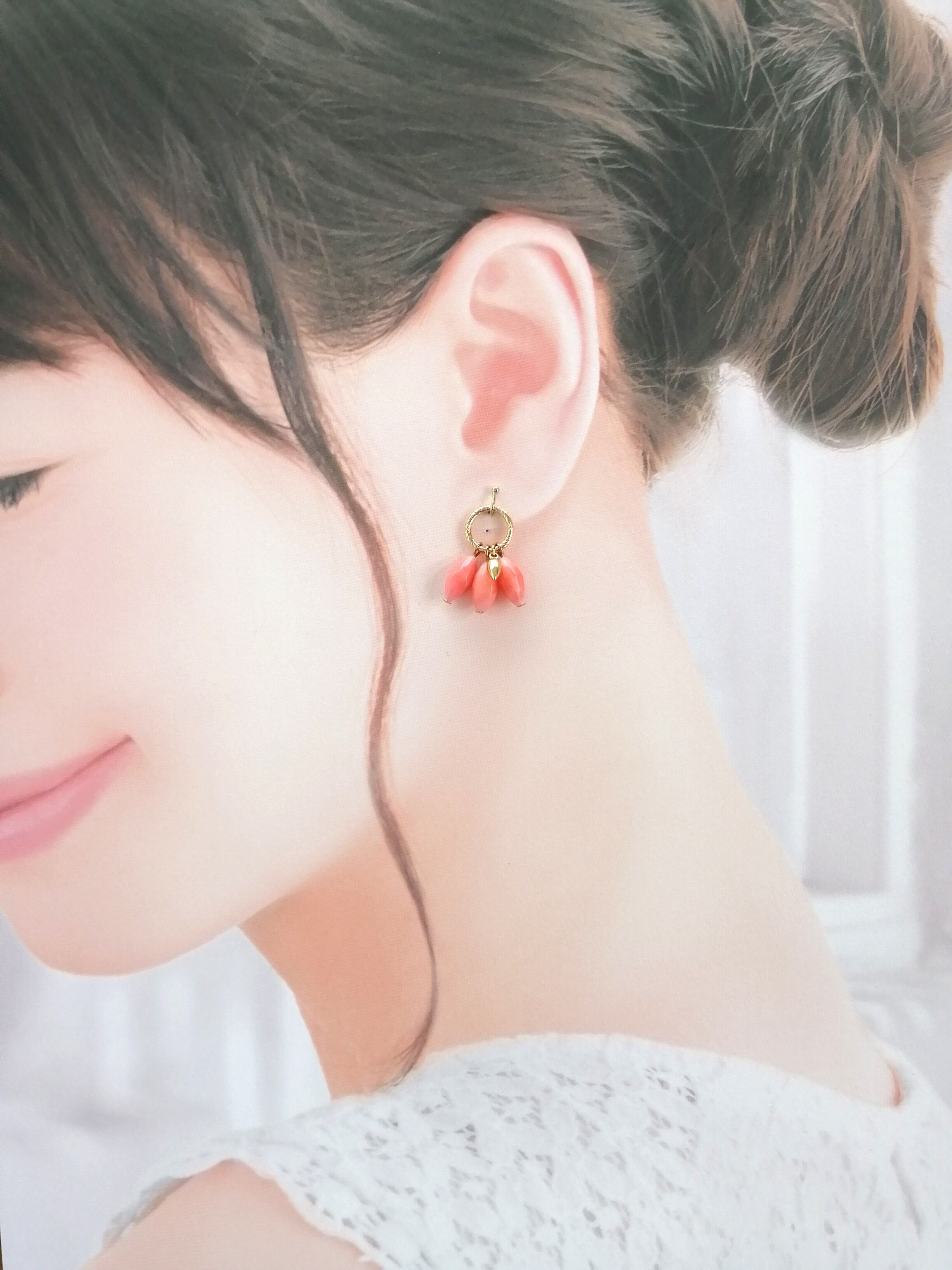 桃色のシーバンブー(海竹珊瑚)とゴールドで、可愛らしいearringsに♡♡