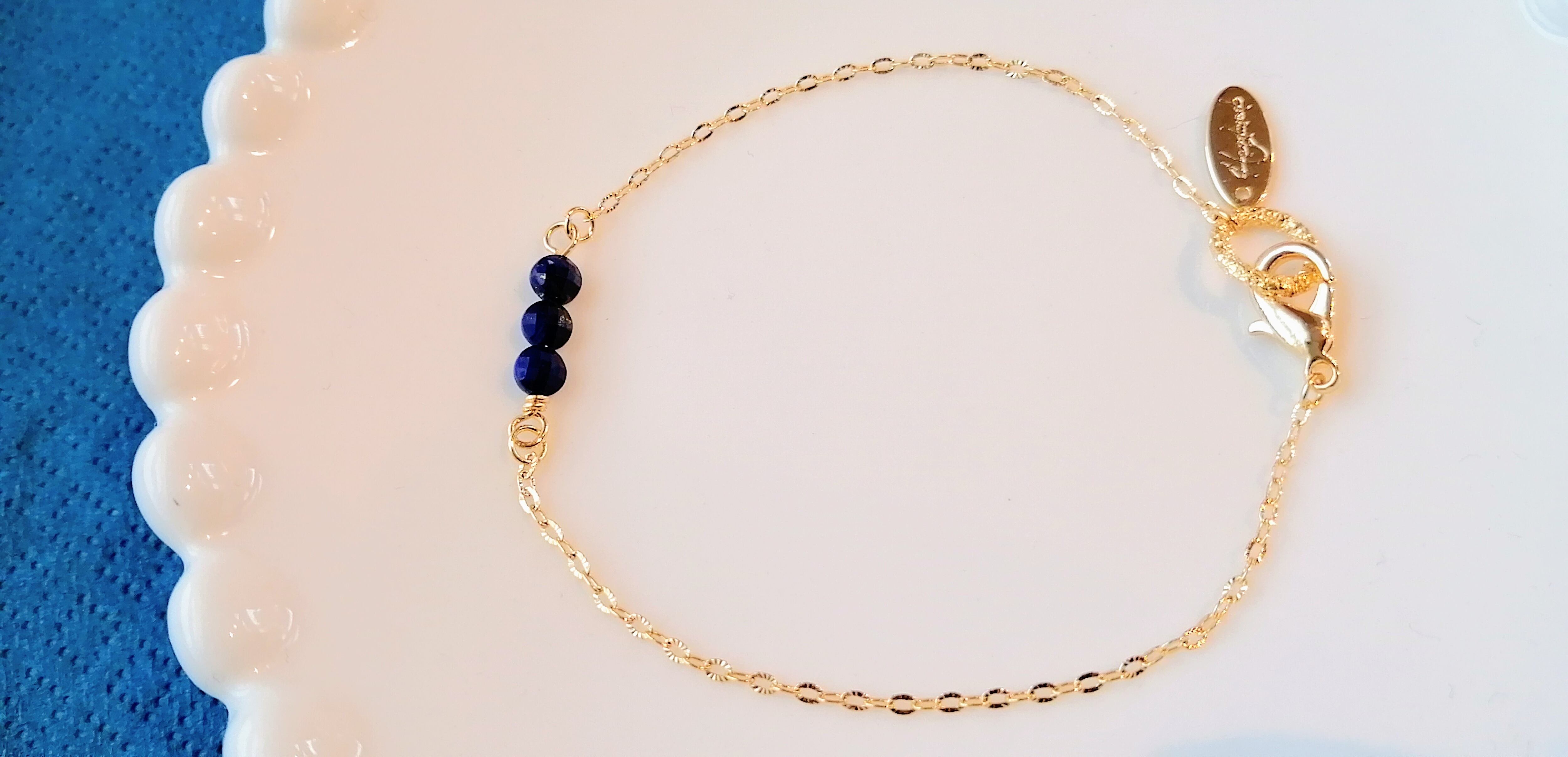 キラキラ上品に輝くラピスラズリを3つ並べて、チェーンの中に閉じ込めました。